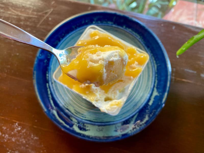 芒果糯米飯是泰國最經典的甜品之一,相信來清邁的人都會品嘗一下,雖然在餐廳、夜市各處都能找到,但如果自問是芒果糯米飯狂迷,很建議去這間很多本地街坊光顧的芒果糯米飯專賣店,事實上已經有不少去過的人都私訊跟我讚好。店子位於清邁夜市附近,以外賣為主,但在店外擺了一張桌子,供客人即場享用。一份芒果糯米飯售價60銖,份量十分豐富,芒果甜美多汁不在話下,糯米飯加了許多斑蘭葉來烹製,入口軟糯,不乾不硬,搭配甜中帶鹹的椰漿和脆脆的炸黃豆,比許多地方的芒果糯米飯都要好吃。聽超友善的店主說,九月至二月是泰國水仙芒最當造的月份,這種芒果果肉細嫩無渣,味道清甜帶有花香,搭配椰漿糯米飯更是絕配。另外,店子也有售榴槤糯米飯(不過我不吃榴槤所以沒有試^^),大家路過可以試試看。