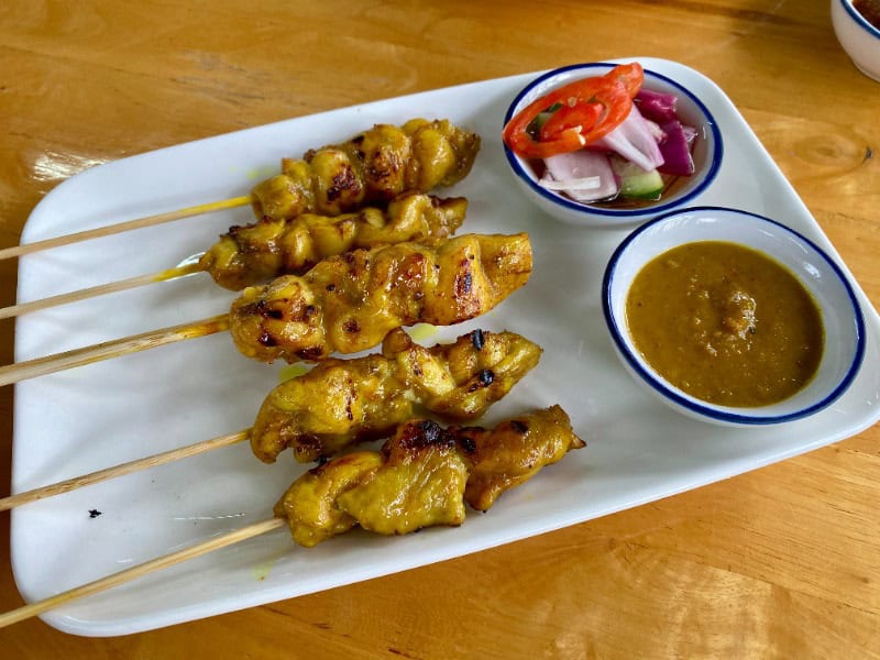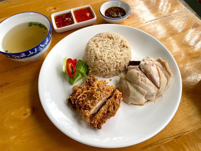 推薦菜式:海南雞併炸雞飯(79銖)、脆皮豬肉(159銖)、沙爹雞肉串(99銖)