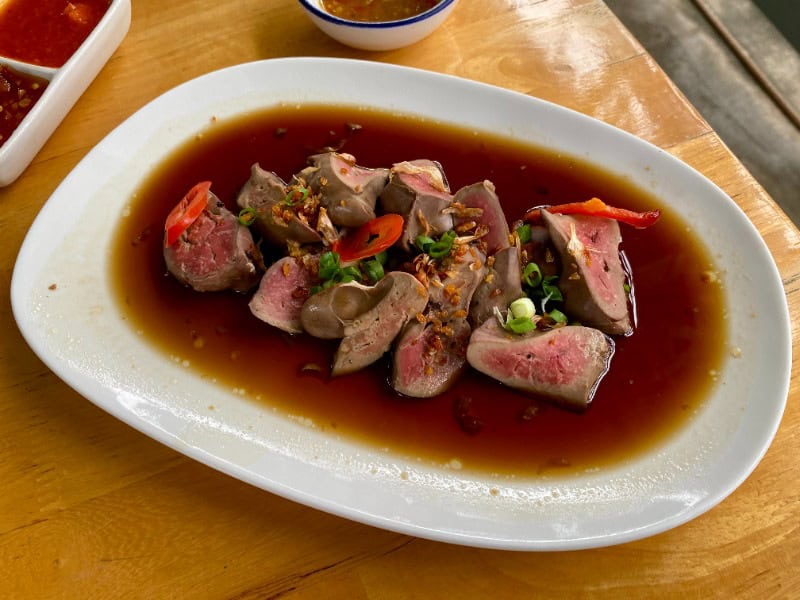 推薦菜式:冬蔭綜合豬肉麵配扁麵條(89銖)、泰北豬紅豬骨米線(45銖)、滷水豬腳(65銖)、滷豬腳麵(60銖)、龍眼汁(40銖)