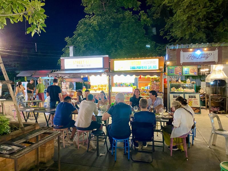 鄰近清邁機場的Kad Manee Market,是最多清邁本地人光顧的美食夜市之一,由食店、酒吧和小食攤檔組成,雖然攤檔數目比疫情前有所減少,但一般遊客喜歡的泰式烤魚、烤泰國蝦、燒豬頸肉、泰式豬手飯、泰北小陶鍋、滷水粉麵、手抓海鮮、芒果糯米飯等等熱門菜式都找得到,價格也不貴。場地除了有一般餐桌座椅,圍繞著水池的用餐區還有多張矮桌讓客人席地而坐,一邊吸著涼風、一邊喝著啤酒,超有道地風味。