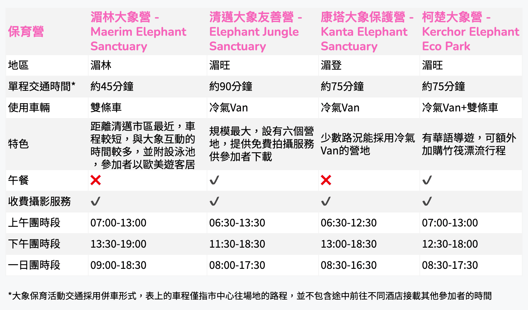 清邁旅遊懶人包!探訪大象是來清邁必做的事!如果要選泰國清邁旅遊最絕無僅有的體驗,此生一定要參加一次的活動,最多人推舉是造訪清邁大象保育營,跟可愛的大象們近距離接觸!在清邁有多間標榜不設騎大象、不設大象表演的大象保育體驗營,有半日團及一日團可以選,行程一般都是安排參加者透過餵食、陪大象散步、與大象玩泥巴浴和幫大象洗澡,跟大象們進行親密互動,各個大象營最大差異在於地點和配套上。我們整理了4間清邁最受歡迎大象保育體驗營的資訊,讓大家一表看清每間大象保育營的特點,方便輕鬆挑選出最適合自己的大象保育營。