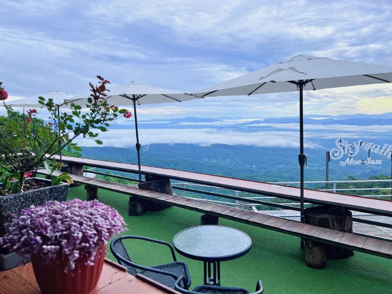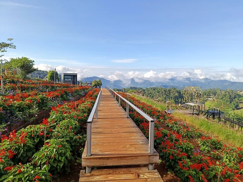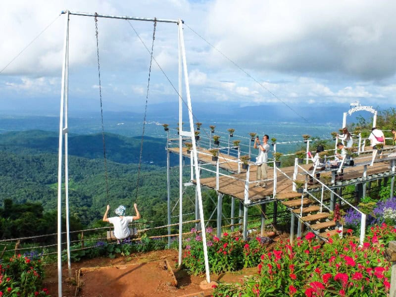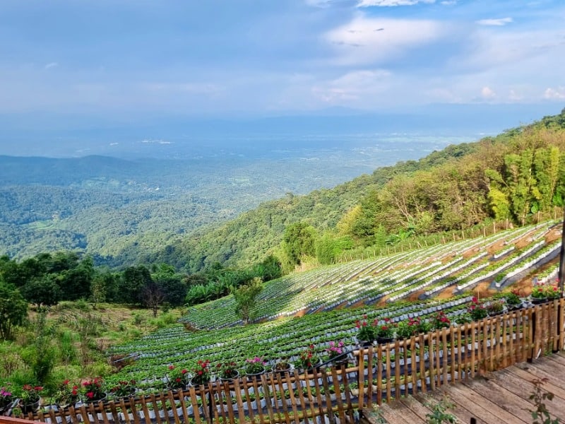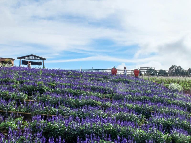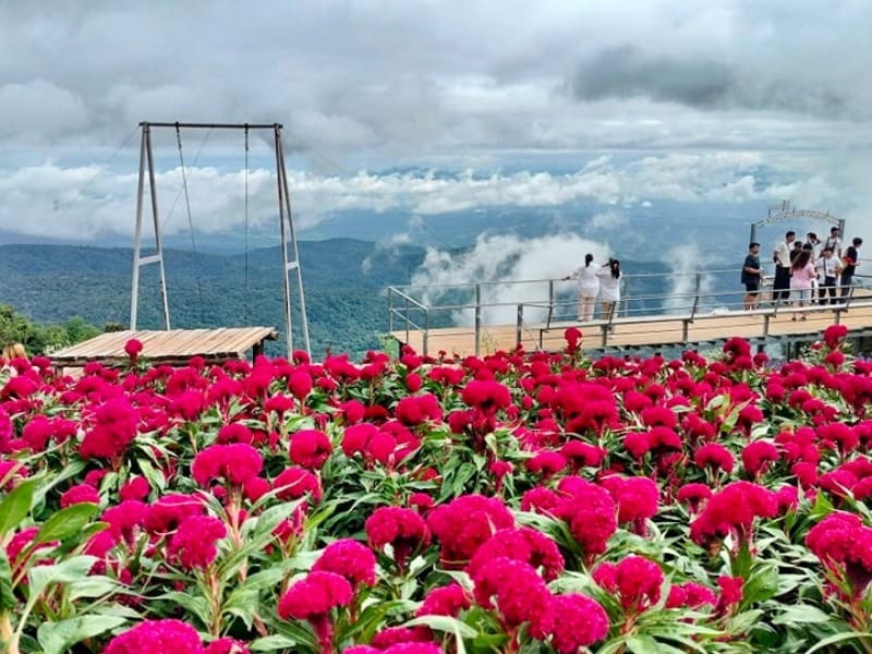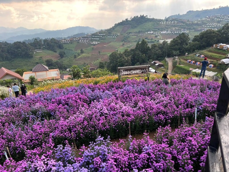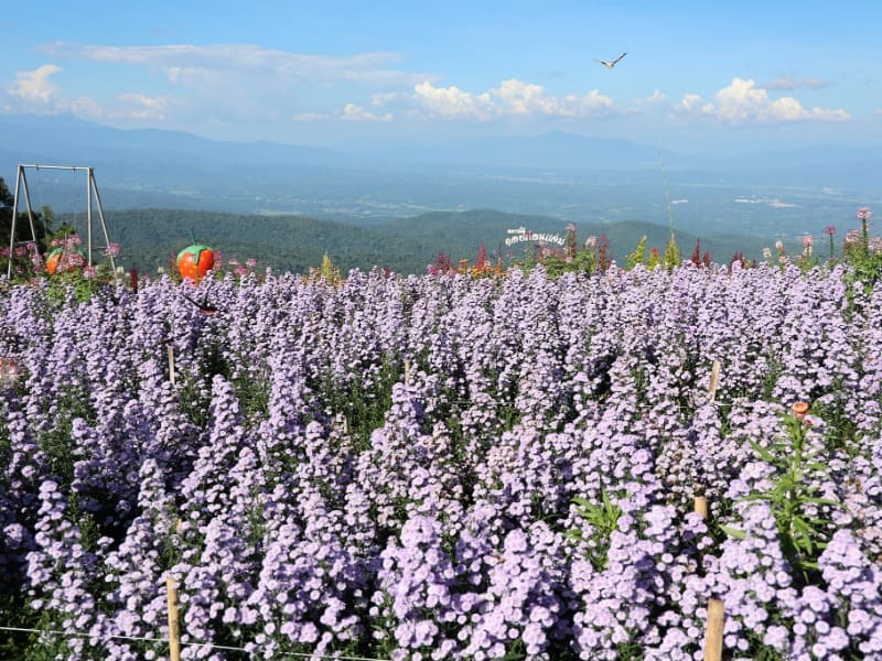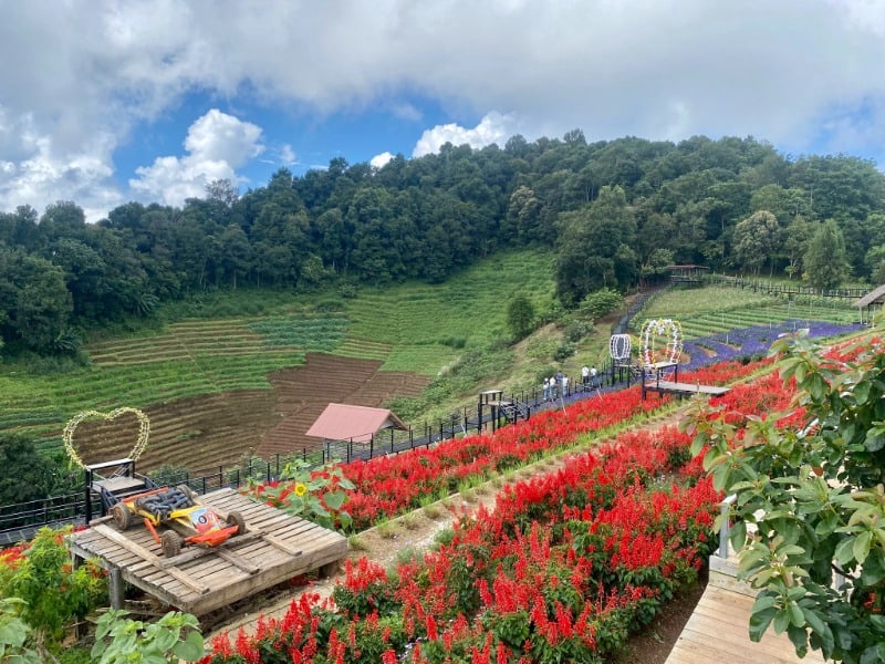 景色怡人的蒙占山風景區位於山頂位置,設有數個收費式花田和咖啡店,每年吸引不少本地人專程來朝聖,其中沿山坡而建、佔地最大的「冬季花園」花種最多樣,有紅色鼠尾草、醉蝶花等等,繽紛燦爛,隨手一拍就能輕易影出澎湃花海的效果,花田上還建有一條接近1公里長的步道,遊客可以繞著花園走一圈拍美照,不用擔心踩在泥地上弄髒鞋子。以一隻豎立於半空的巨型之手作標記的「Plai Fa草莓園」,分別種有鮮花和草莓,在梯田下方的竹平台和巨型鞦韆都是打卡必影位。至於坐擁180度開揚景致的「Skywalk咖啡店」,擁有最完美的視野,氣氛非常chill,遊客參觀花田後很推薦來這裡喝喝飲料放放空。