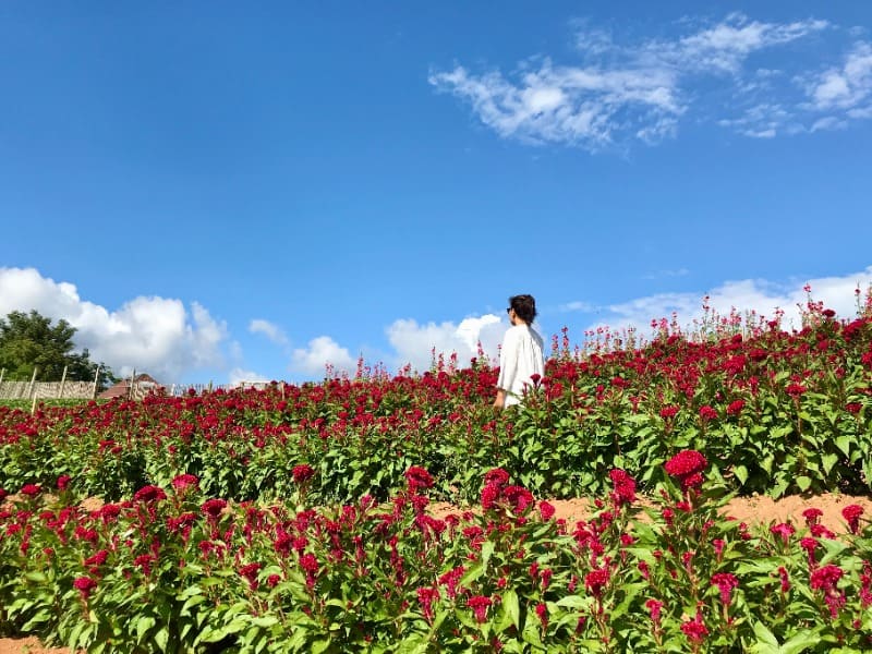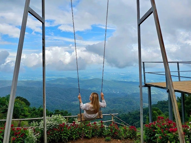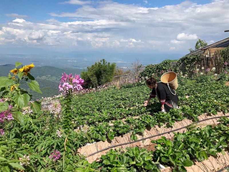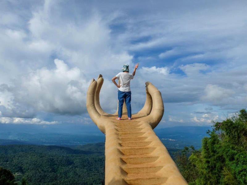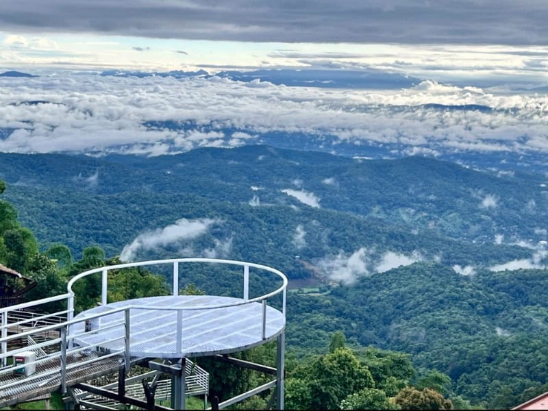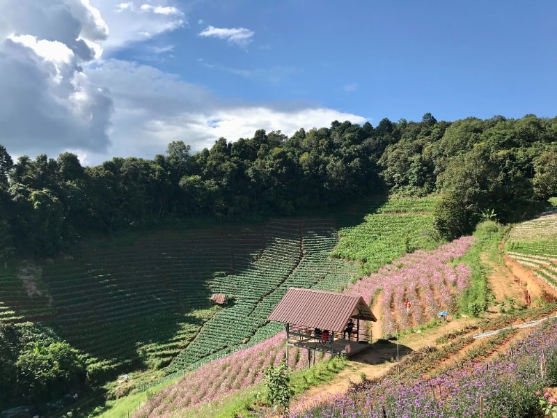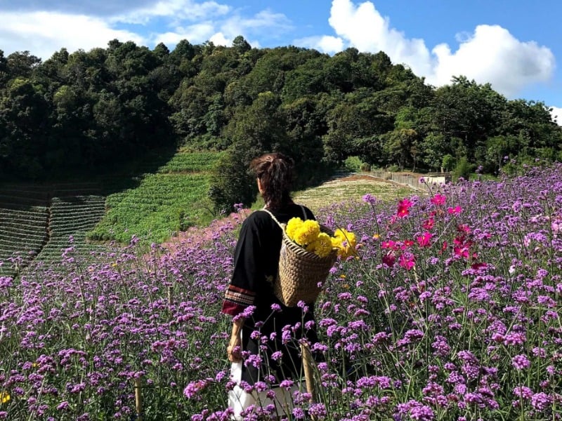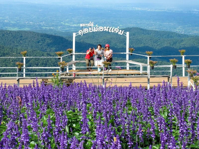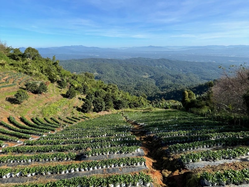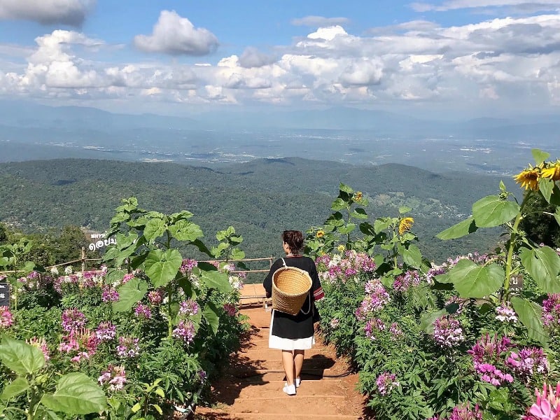 景色怡人的蒙占山風景區位於山頂位置,設有數個收費式花田和咖啡店,每年吸引不少本地人專程來朝聖,其中沿山坡而建、佔地最大的「冬季花園」花種最多樣,有紅色鼠尾草、醉蝶花等等,繽紛燦爛,隨手一拍就能輕易影出澎湃花海的效果,花田上還建有一條接近1公里長的步道,遊客可以繞著花園走一圈拍美照,不用擔心踩在泥地上弄髒鞋子。以一隻豎立於半空的巨型之手作標記的「Plai Fa草莓園」,分別種有鮮花和草莓,在梯田下方的竹平台和巨型鞦韆都是打卡必影位。至於坐擁180度開揚景致的「Skywalk咖啡店」,擁有最完美的視野,氣氛非常chill,遊客參觀花田後很推薦來這裡喝喝飲料放放空。
