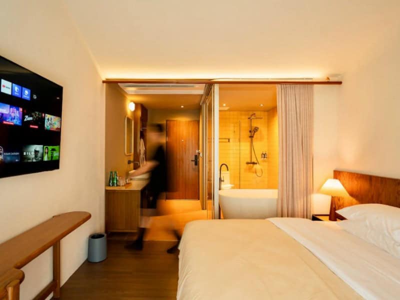 • 2023年開業的新酒店,一切都非常簇新,建築外型和房間都非常現代化,提供三種房型,房間寬敞,布置簡潔俐落,沒有多餘裝飾,備品充足,洗臉盆比其他酒店大一倍,配備了智能電視及免治馬桶。豪華特大床房附有開放式浴缸,睡床旁邊就是浴缸,情侶夫妻入住會比較合適。