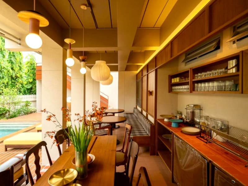 • 酒店最引人注目是設計感十足的泳池,兩旁擺放著一排排精緻的木躺椅,可供住客休憩。公共區域幾乎是每位客人的必去之地,可以在那裡休息、用餐、喝酒和社交,除了配備設備齊全的廚房,並提供免費飲用水、冰塊、小吃、咖啡機甚至泡麵,愛熱鬧的人可以隨心所欲地與他人互動,而不是被困在房間裡。