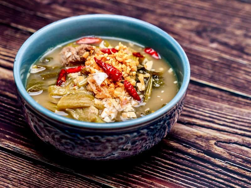 米芝蓮指南推薦菜式:泰北辣豬肉律沙碎(95銖)、泰北酸辣魚肉空心菜湯(95銖)